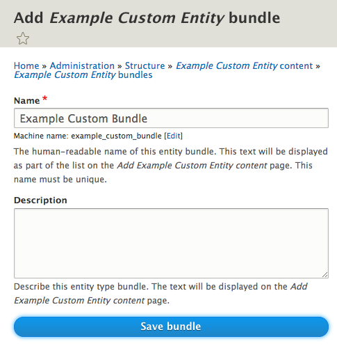 Using ECK, add a new bundle to this entity type by selecting “Bundle list” from the dropdown beside your newly created entity type. I’ve named mine “Example Custom Bundle”